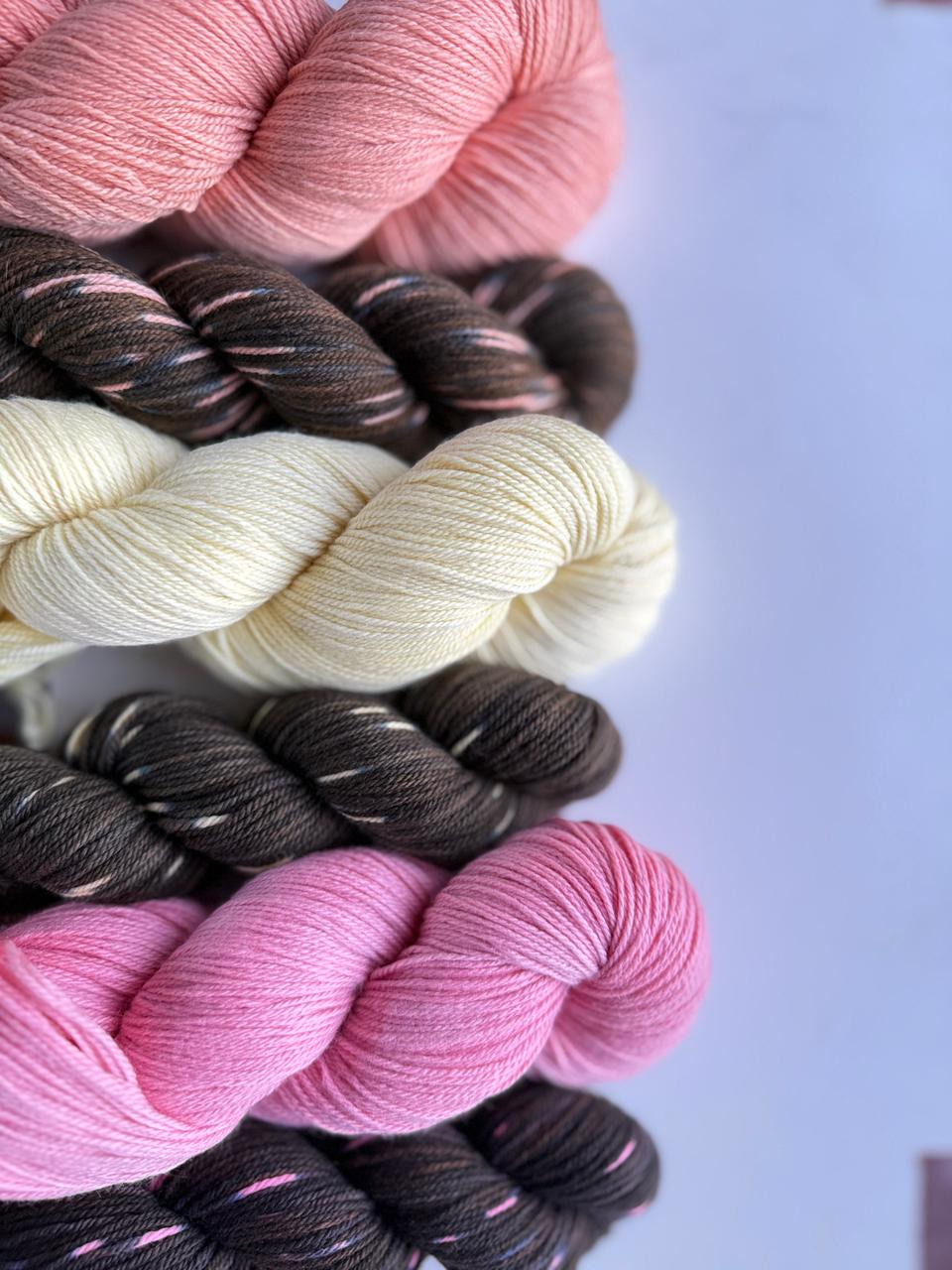 Una madejs de 100grs en color semipleno y una madeja de 50grs en color oscuro con pintitas de color a tono con la madeja de 100grs
